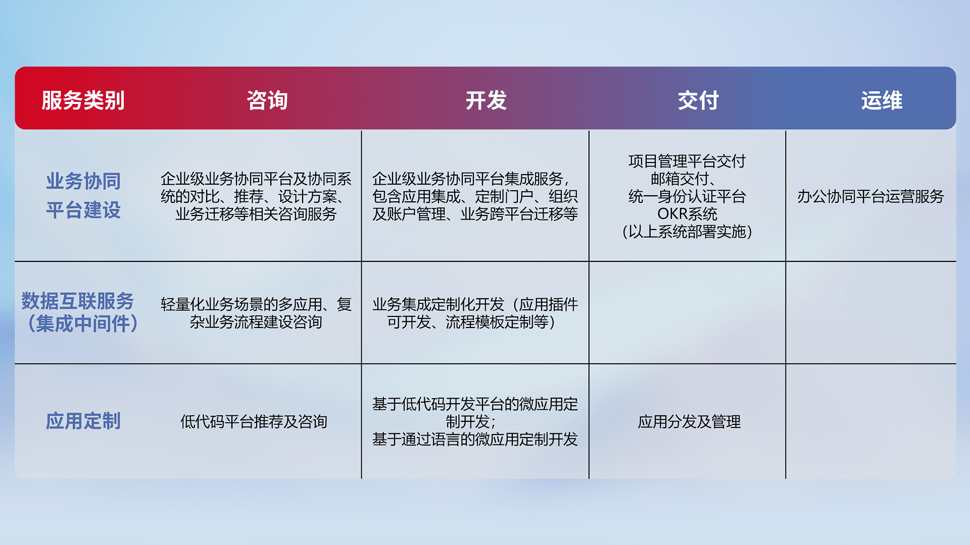 针对钉钉、、、企微、、、、IDaas等平台级产品提供产品的规划、、、、方案、、、、交付、、定制化开发等服务,,实现如统一协同办公、、智能客户服务、、、、混合会议管理、、智能数据查询、、、、等业务场景,,,实现数字化转型。。。。